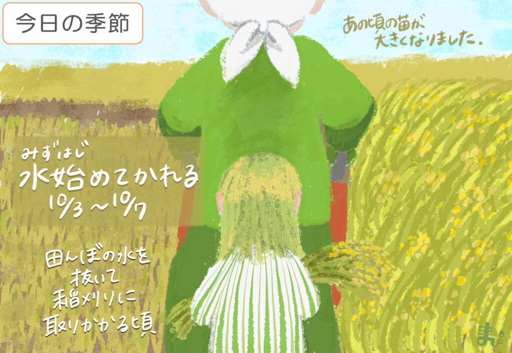 田んぼの水を抜いて、稲刈りに取りかかるころ。1つの稲には、100~200粒の米が付いているそう。4月終わりの七十二候「霜やんで苗いずる」(苗が育つころ)から、時間と生長のつながりを感じる季節。