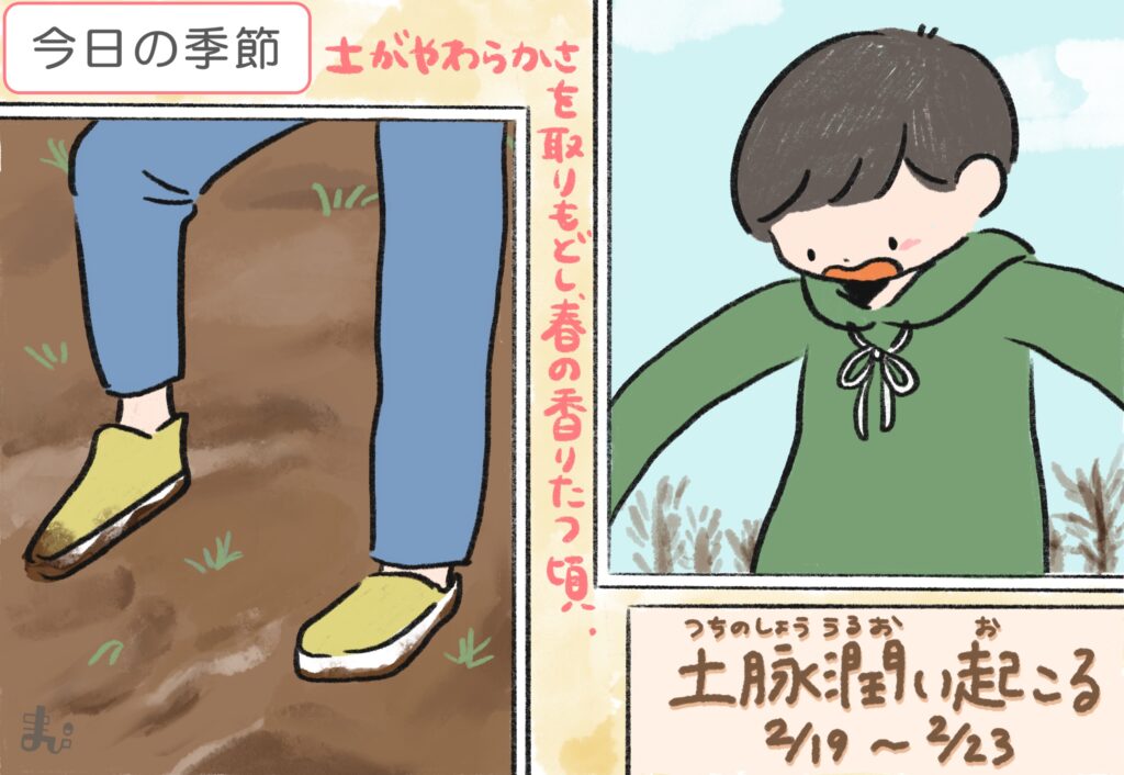 春の雨が大地を潤しはじめる頃。雪が雨に代わり、土がやわらかさを取り戻す。そこから匂い立つのは、春の香り。まだ気温が低いため、解けた水が乾きにくく、ぬかるみになりやすい。そんな土は「春泥(しゅんでい)」とも呼ばれる。土から春を感じる季節。