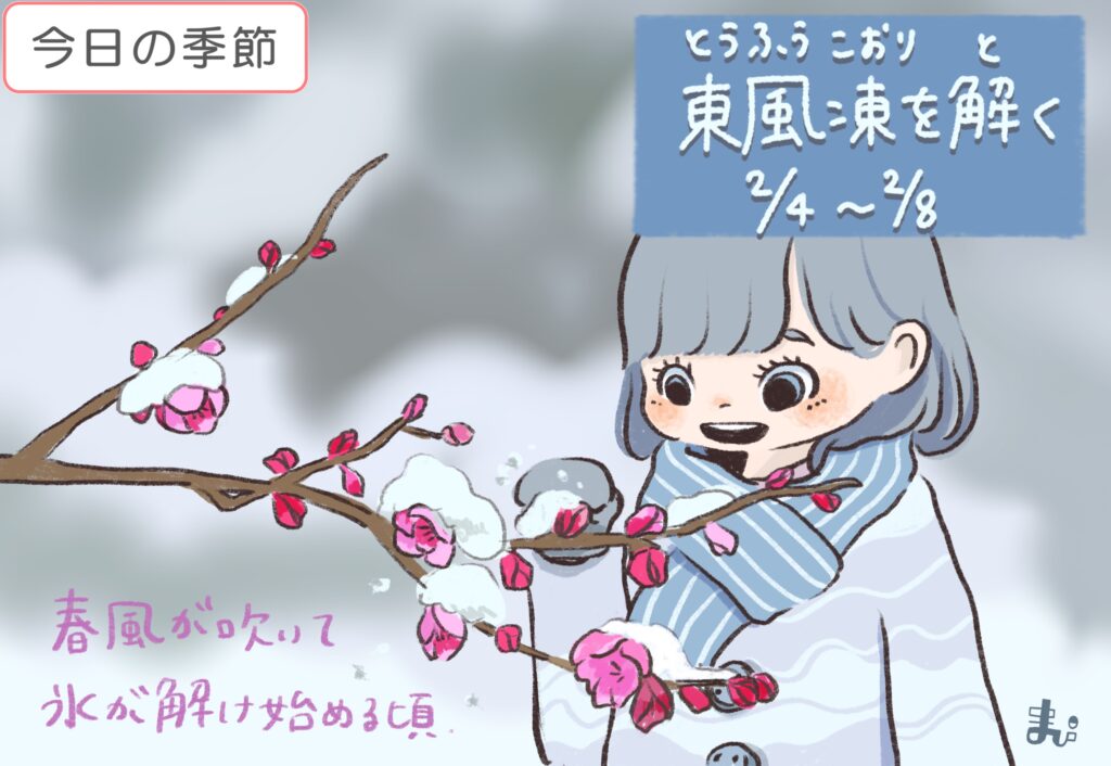 春風が吹いて、氷が解け始める頃。春風といえば南からのイメージだが、東風(とうふう/こち)と呼ぶのは中国の名残り。(中国では東が春を司る方角。)地域によっては、「朝東風」「梅東風」「雲雀(ひばり)東風」とも。春を運ぶ東風が吹いて、梅が咲き始める季節。