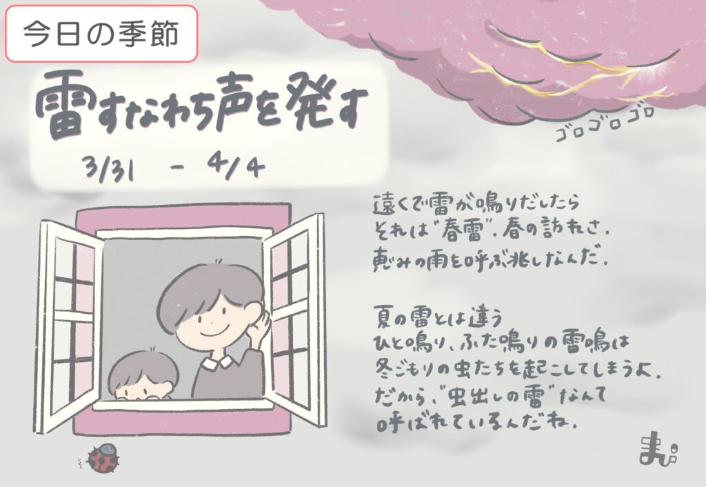 春の訪れを告げる雷が鳴り始める頃。この頃に鳴るカミナリは、春の訪れを告げる「春雷」。昔は恵みの雨を呼ぶ兆しとして喜ばれていた存在。この音には虫たちもびっくりするみたいで、冬ごもりをしていた虫を起こす「虫出しの雷」とも呼ばれる。カミナリ予報を、春の予報に感じてきた季節。