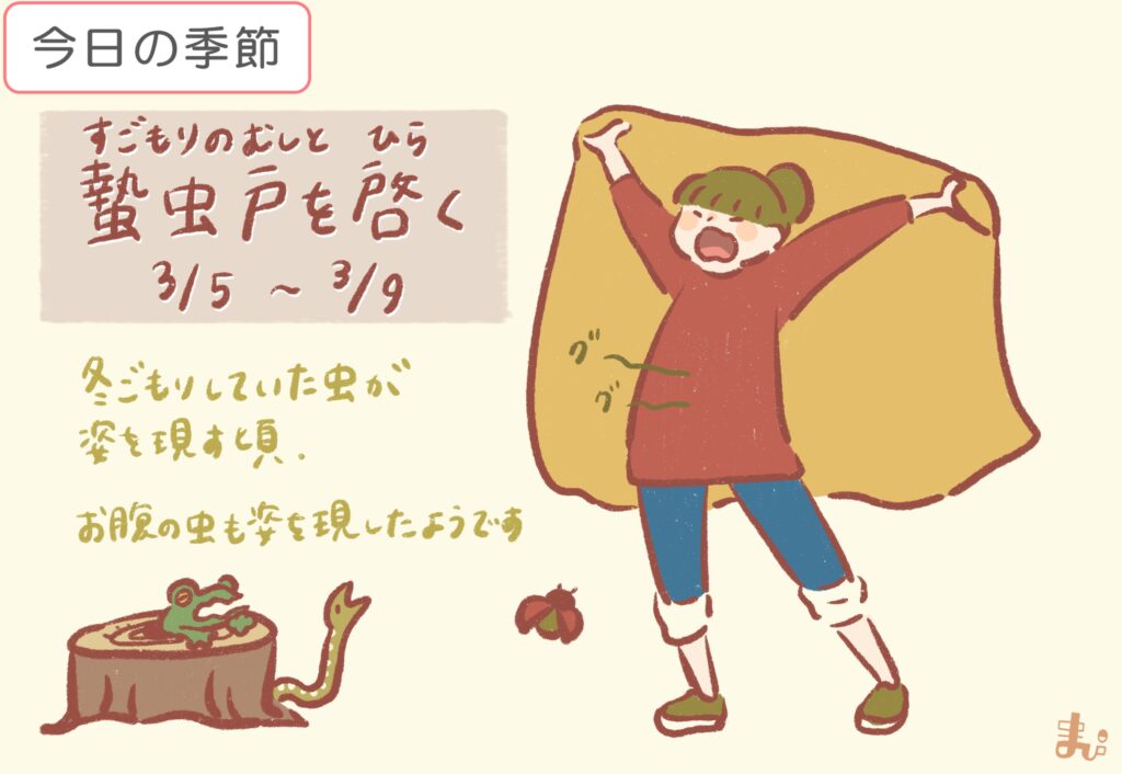 冬ごもりをしていた虫が、姿を現す頃。ここでの「虫」とは、ヘビ、カエル、アリ、鳥などほとんどの生き物を指す。また、「虫」は人のカラダの中にもいると考えられ、空腹でおなかが鳴るのは、その虫の声とされていた。みんなが戸を開いて、起きはじめる季節。