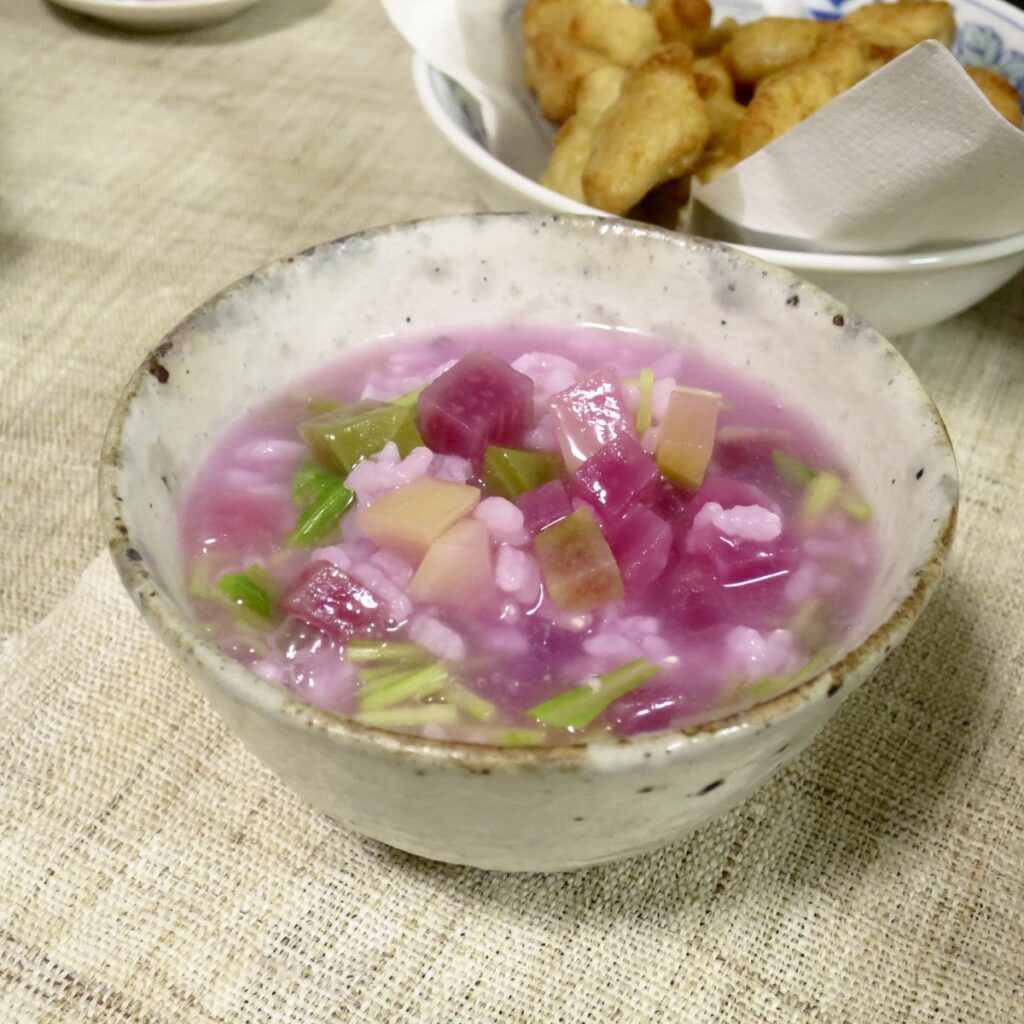 ところが表面が緑っぽい小さな大根を切ると、これが紅芯大根だった。赤いけれどまぁいいかとそのまま作ると、わりときれいな紅白粥になった。(写真だといまいち伝わりきらないが)