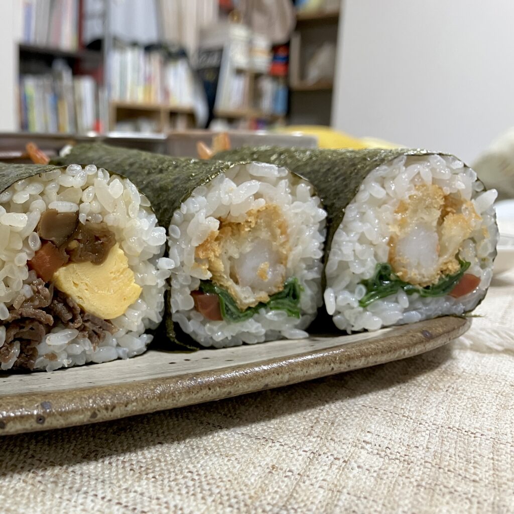 我が家で巻き寿司を作る時は、まーしーが具担当(勝手に任せてる)、ぴのが巻く担当です。ぴのはエビフライ入りの巻き寿司が好きなので、今年も我が家はエビフライ入り恵方巻きです。具がちゃんと中央にくるように巻けて、今年は大満足◎