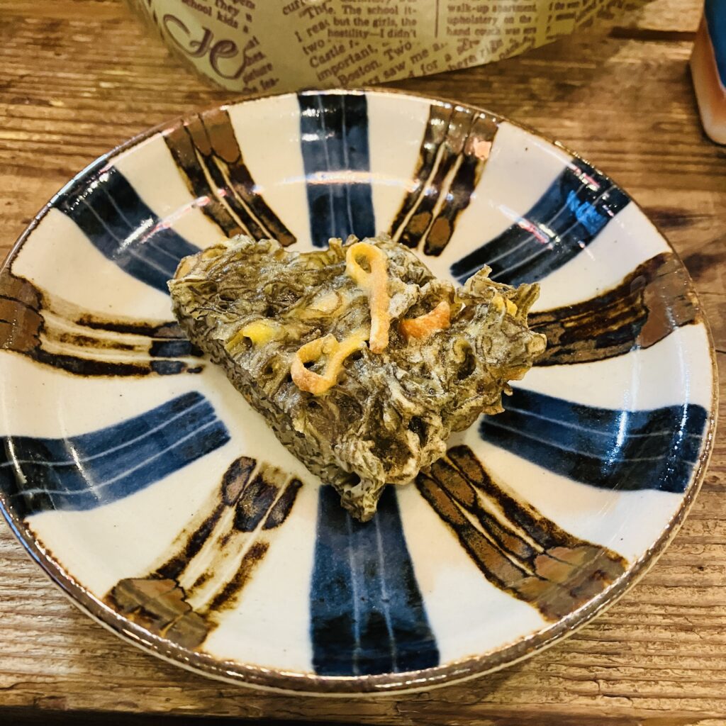 人生で2回目の沖縄料理屋。1回目の時は、ジーマーミー豆腐や、ゴーヤチャンプルー、ラフテーなどの代表的な料理を食べたので、今回は、まだ食べたことない料理に挑戦したいと思って選んだのが、これ。もずくの天ぷら。