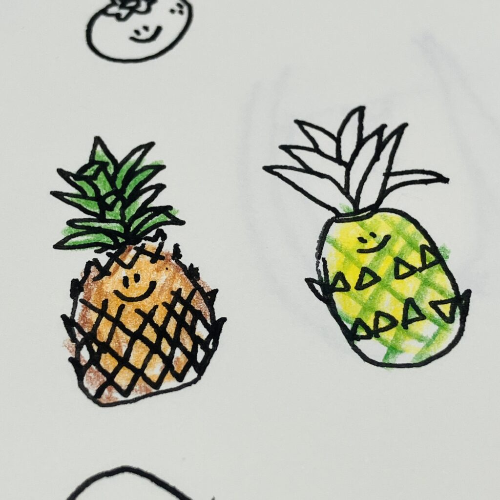 パイナップルを描いてる時に、「あ!パイナップルって、オレンジっぽいのと、黄色+緑っぽいのとあるんや!」と、ハッとした。