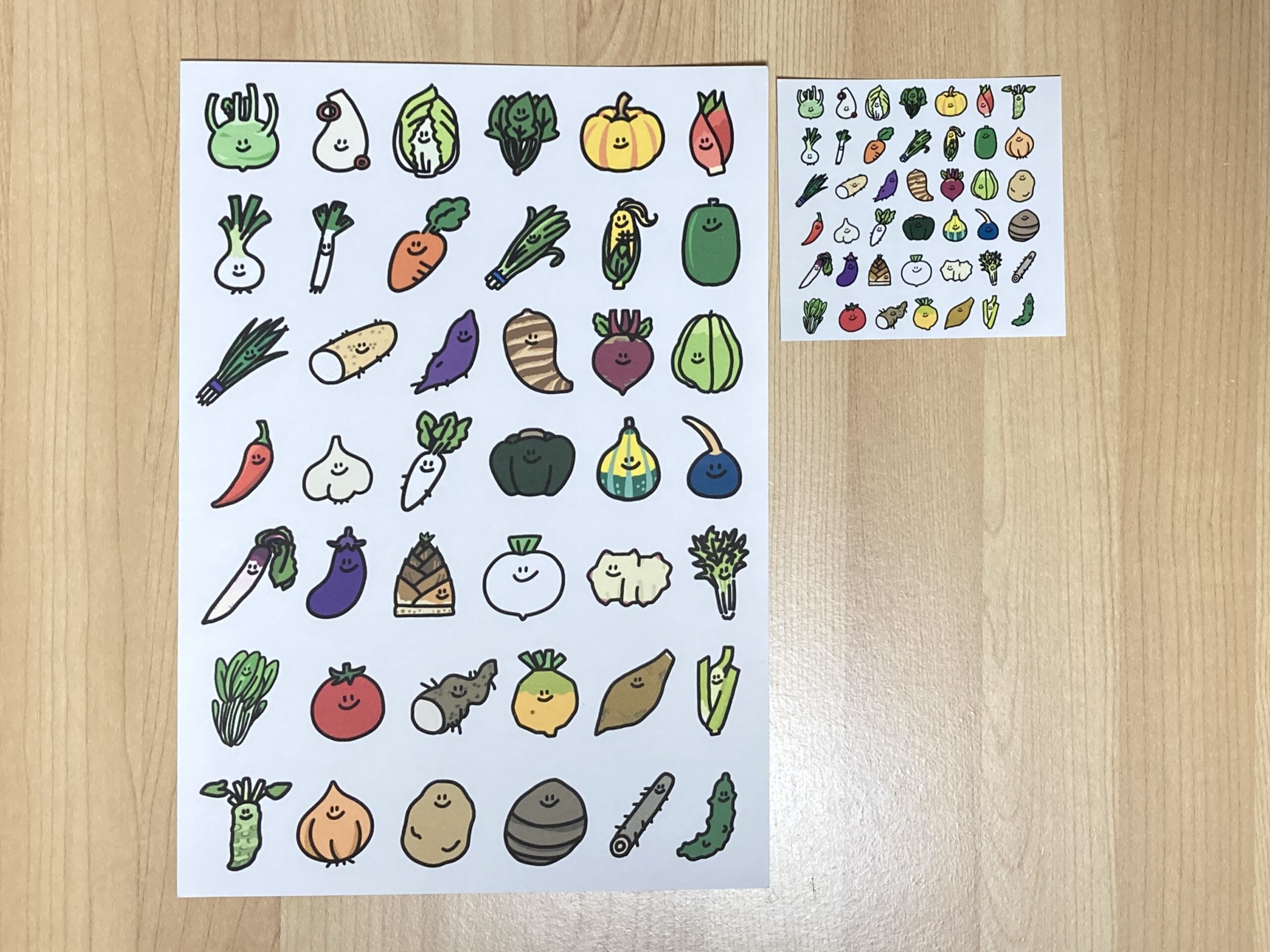 おやさいシールの大きい版です。「小」とラインナップは同じ。大きさの違いは、真ん中の画像をご参考に。「小」と同じ説明書がついています。