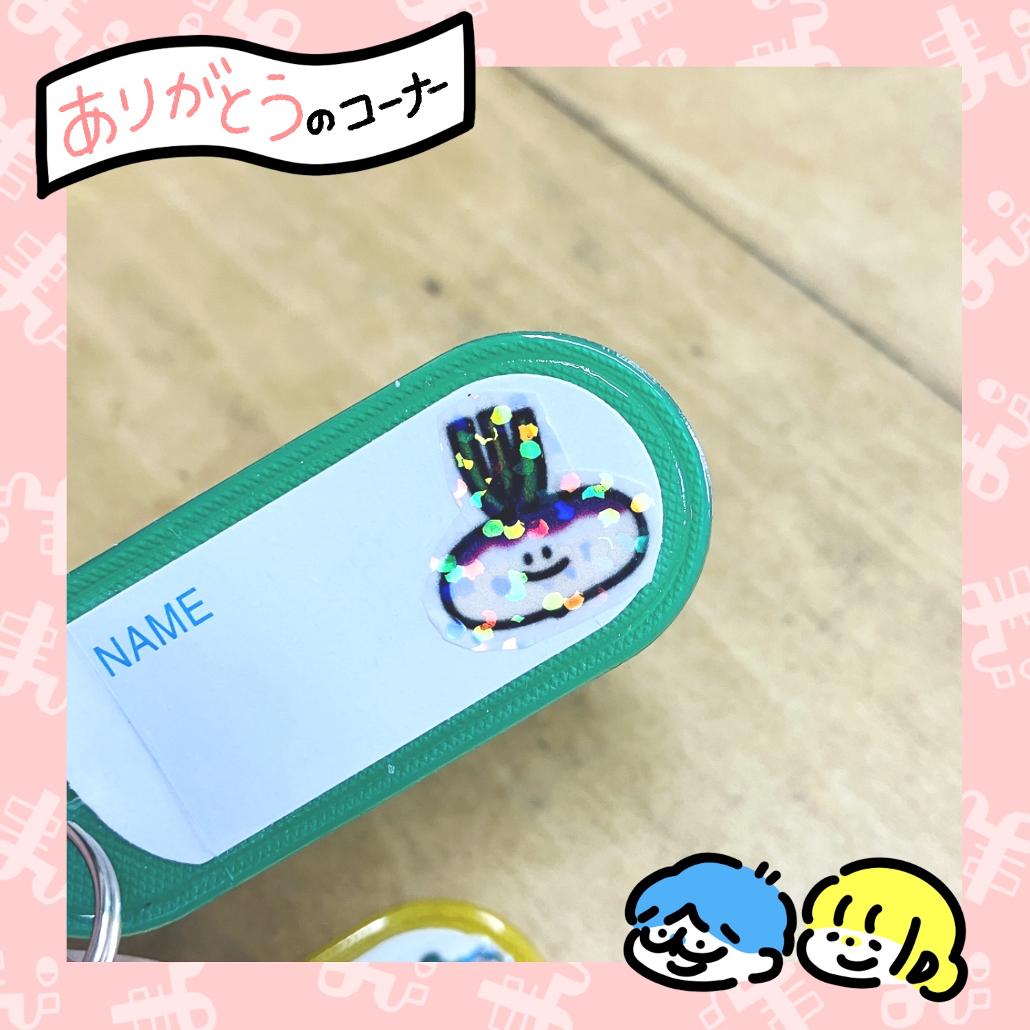 小さなネームタグに、キラキラシールを貼った、おやさいシールを貼って、アレンジ👍